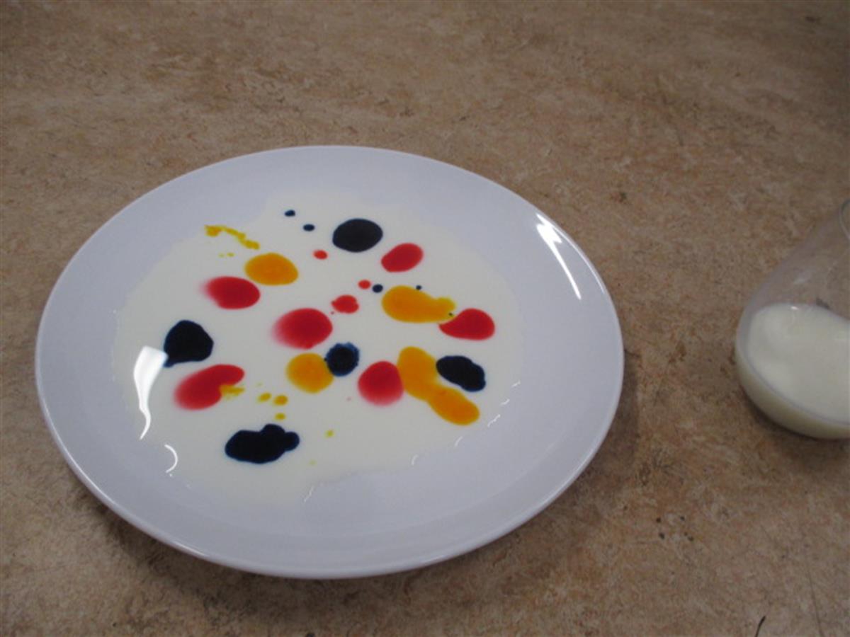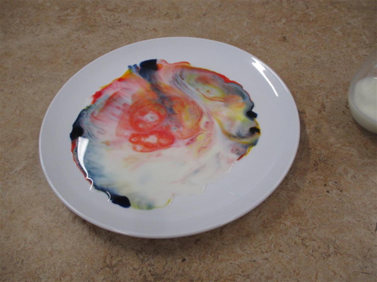 If you put drops of different coloured food dye on a plate of milk the colours will stay as drops.
